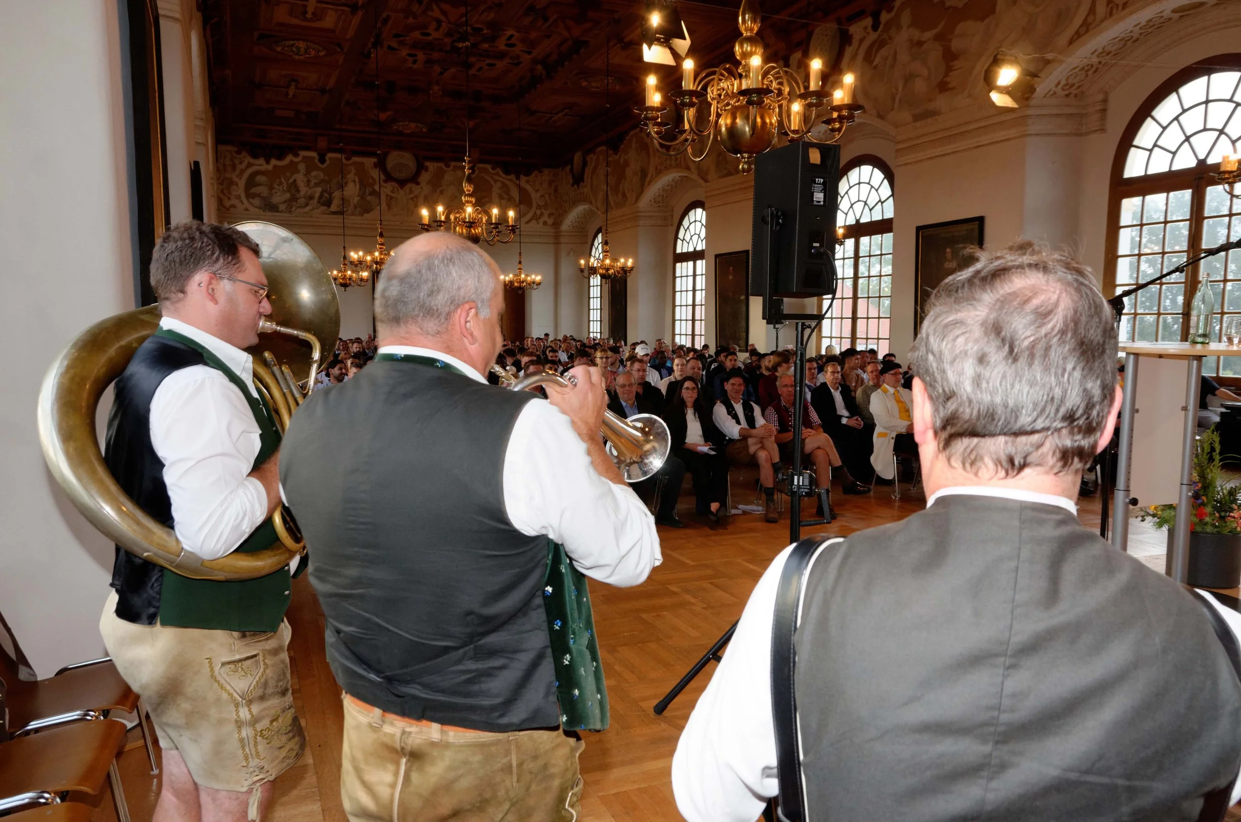 Der Dachauer Obermeister Klaus Durchdenwald eröffnete die Veranstaltung standesgemäß in Tracht und hieß die Gäste in seiner Heimatgemeinde herzlich willkommen. Er versäumte es bei dieser Gelegenheit nicht, das Schloss mit seinem Saal und der prächtigen Renaissancedecke vorzustellen.